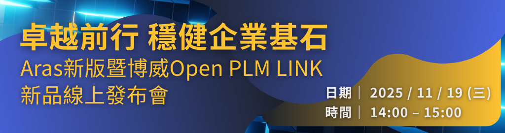 我們誠摯邀請您參加由博威顧問公司舉辦的線上新品發布盛會,與您共同掌握Aras最新的PLM(Open PLM)解決方案與合作服務。本次活動將重點介紹Aras的全新版本,以及博威Open PLM LINK產品,並分享訂閱模式的最新趨勢與實務應用。